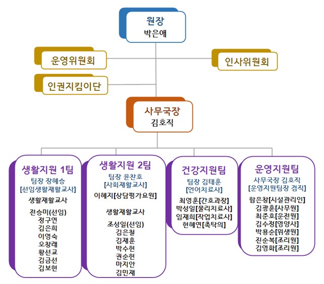 원장 | 사무국장 | 사무원 | 사회재활교사 | 간호조무사 | 물리치료사 | 작업치료사 | 언어치료사 |
