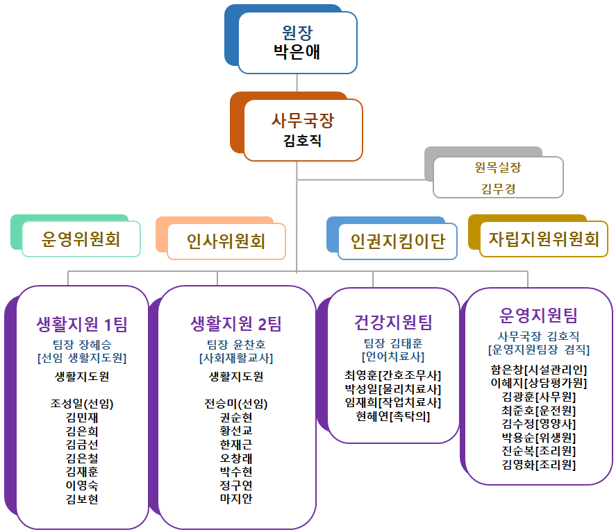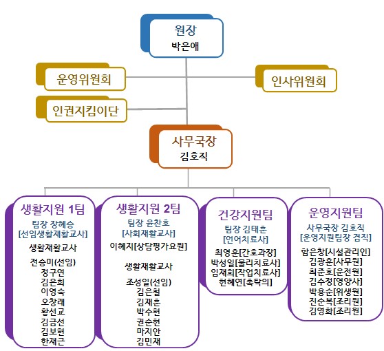 | 원장 | 사무국장 | 사무원 | 사회재활교사 | 간호조무사 | 물리치료사 | 작업치료사 | 언어치료사 |