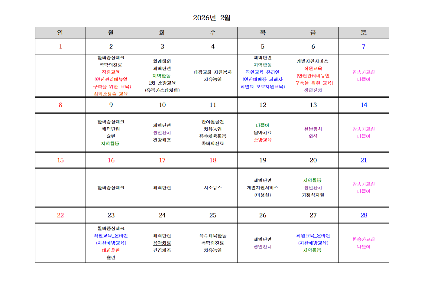 거주인별 질환에 따른 적절한 투약관리 및 혈압, 혈당, 체온, 체중 등 활력증상체크를 통해 정기적으로 거주인들의 건강을 확인하며, 관리가 될 수 있도록 지원함.