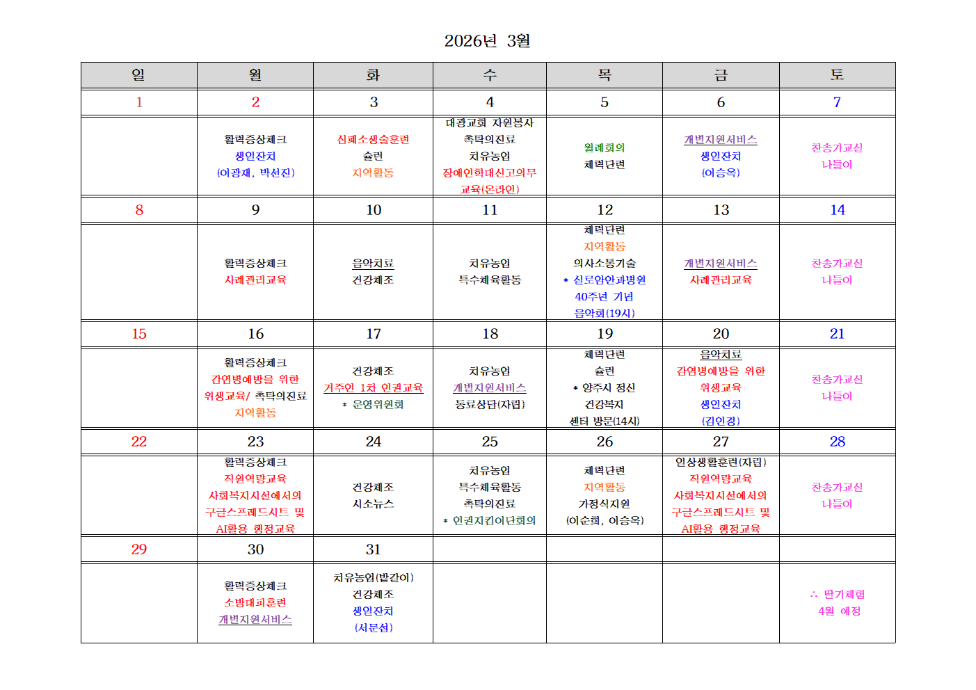 양주시장애인체육회와의 연계, 스포츠바우처 및 원내 체력단련기구를 활용한 생활체육프로그램을 통해 일상생활에서 필요한 신체기능 및 체력을 향상시켜 건강한 일상생활을 제공하고 있음. / 휘바스포츠, 스트레칭교실, 특수체육, 슐런교실, 근력UP, 체력UP