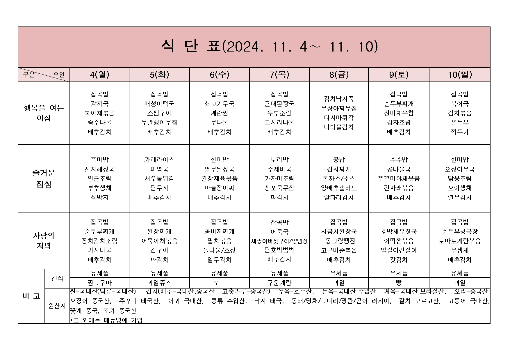 2024년 11월 04일 ~ 2024년 11월 10일 식단표