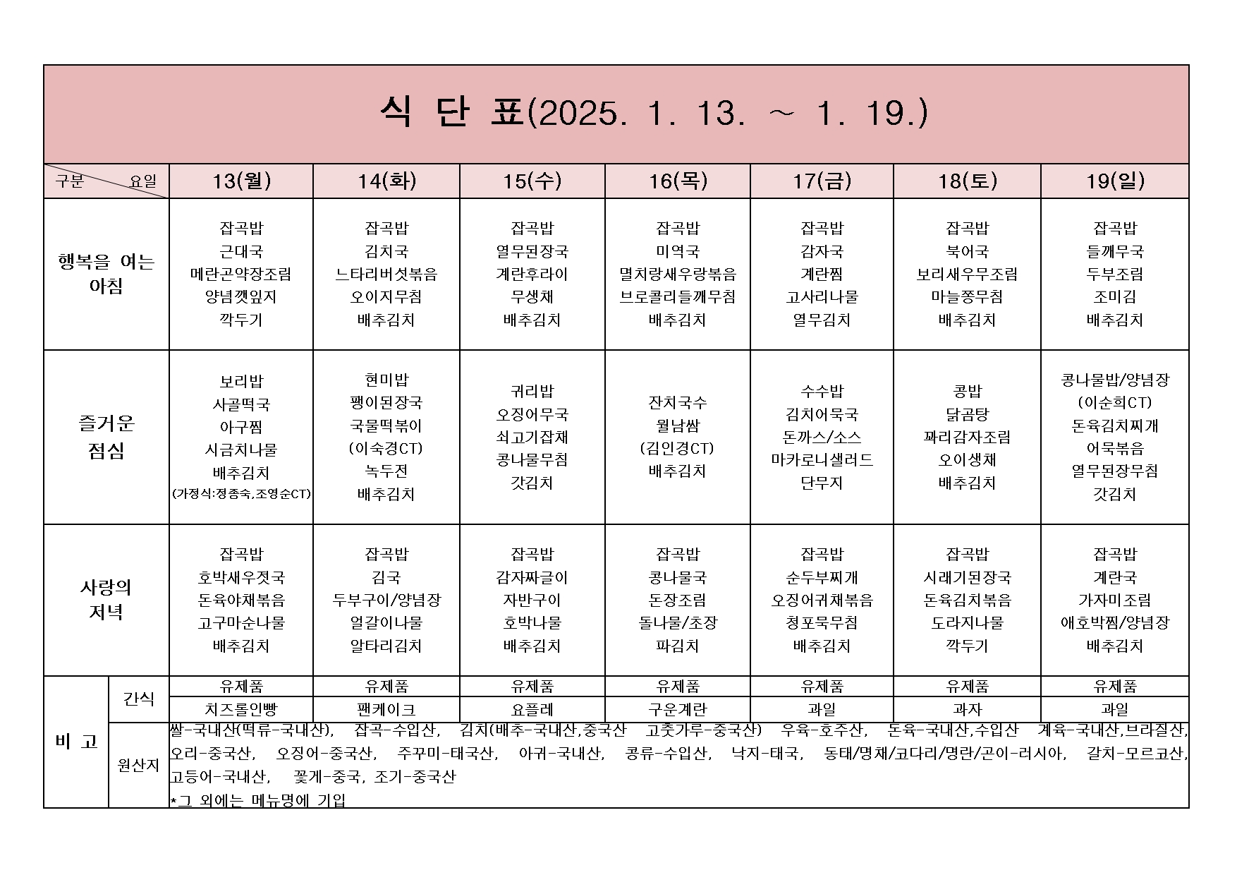 2025년 1월 13일 ~ 2025년 1월 19일 식단표