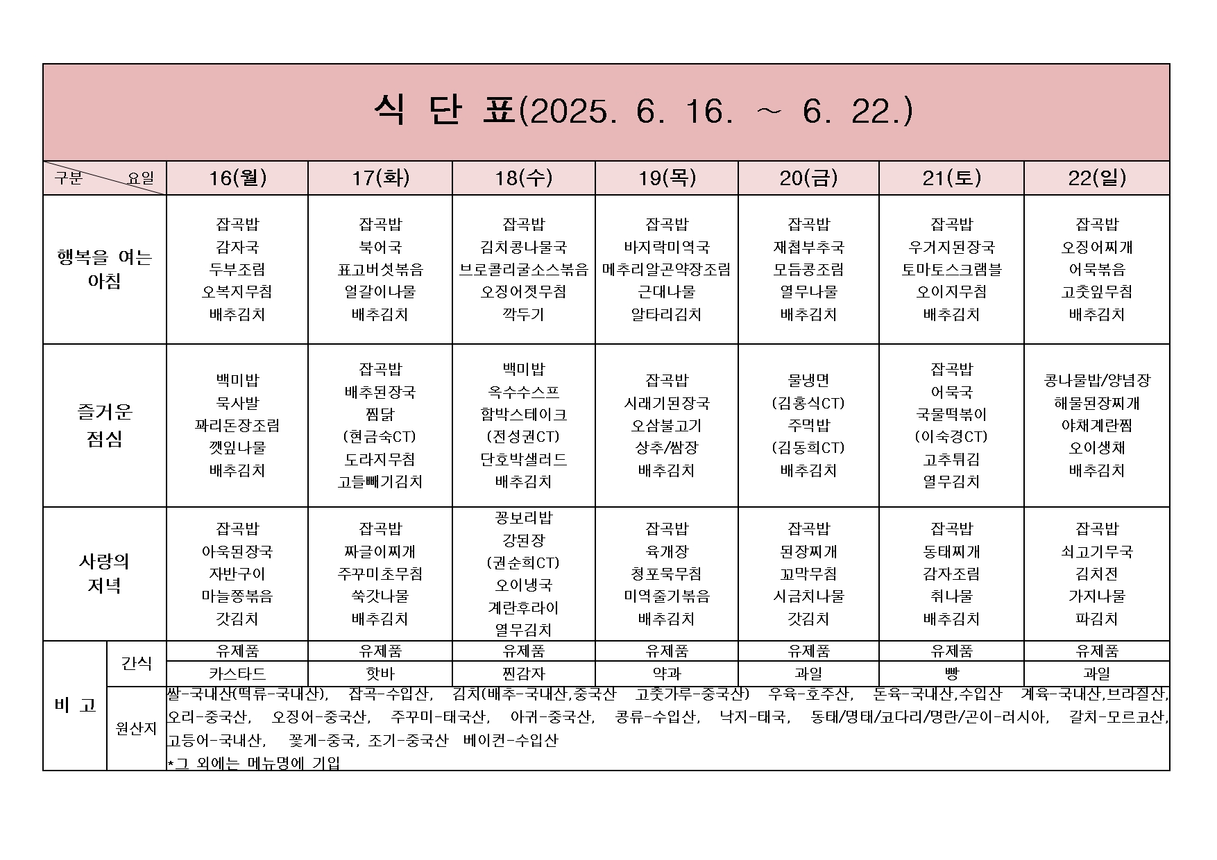 2025년 6월 16일 ~ 2025년 6월 22일 식단표