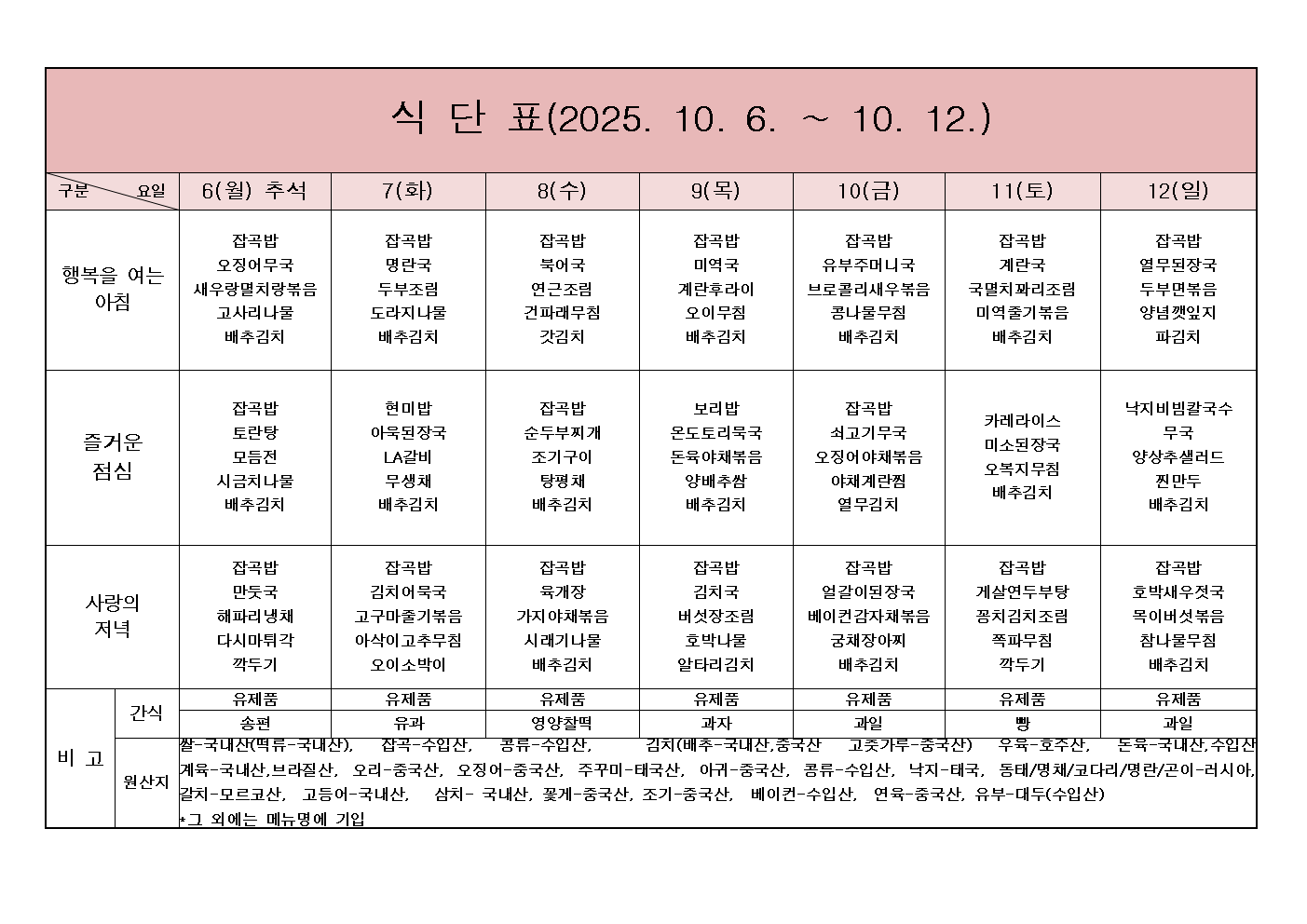 2025년 10월 6일 ~ 2025년 10월 12일 식단표