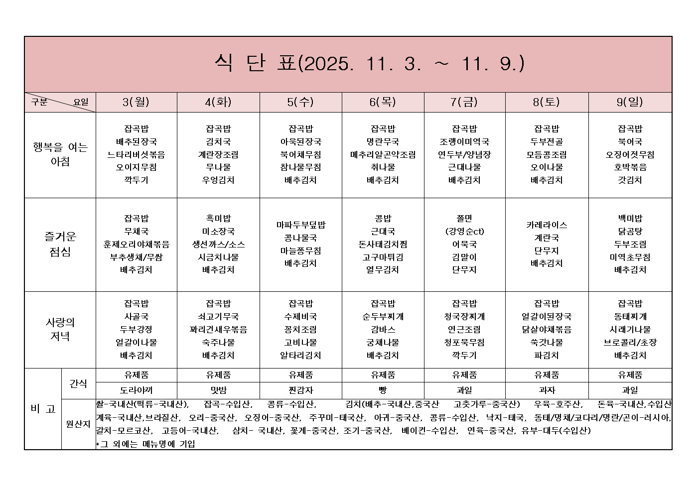 2025년 11월 3일 ~ 2025년 11월 9일 식단표