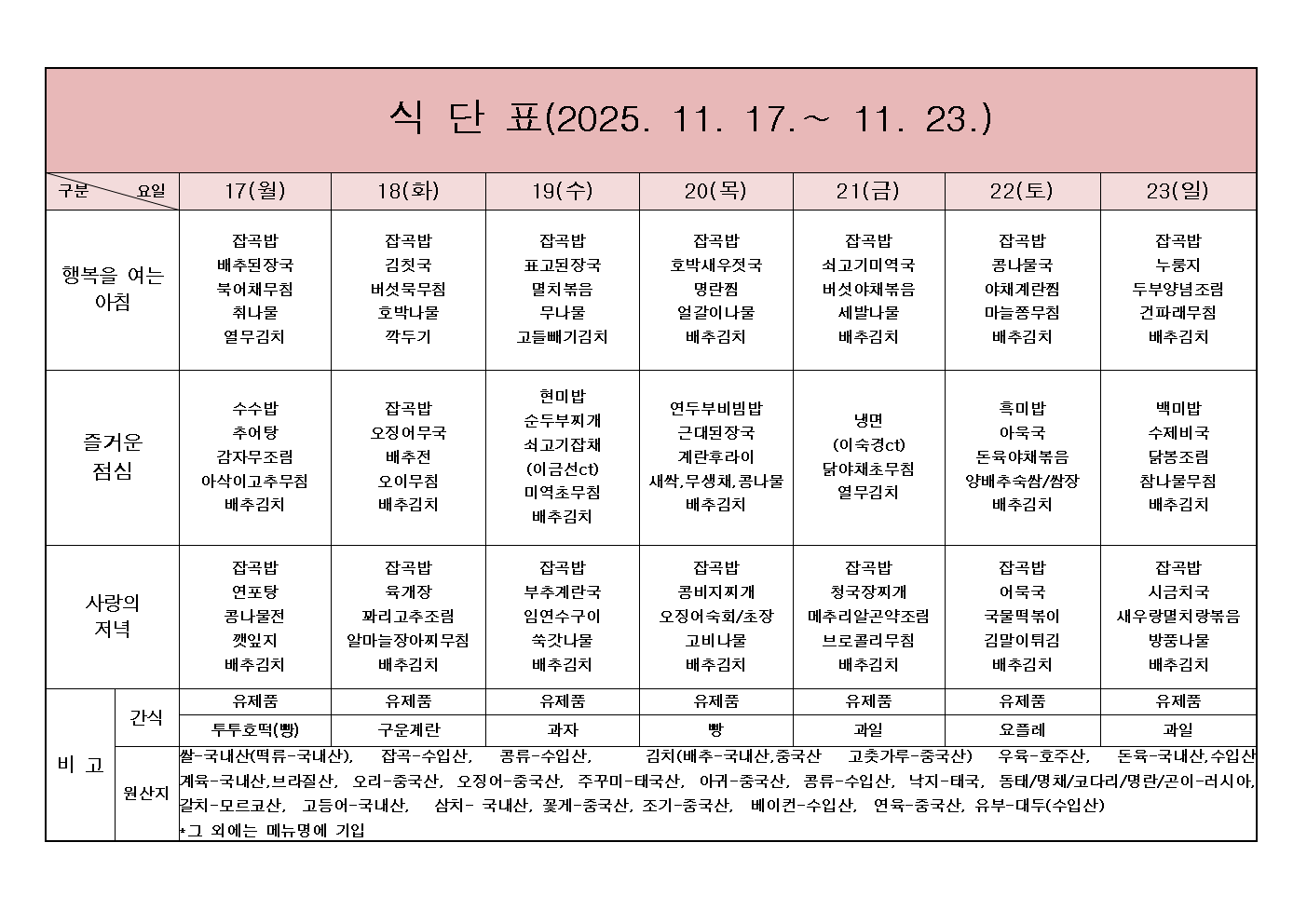 2025년 11월 17일 ~ 2025년 11월 23일 식단표