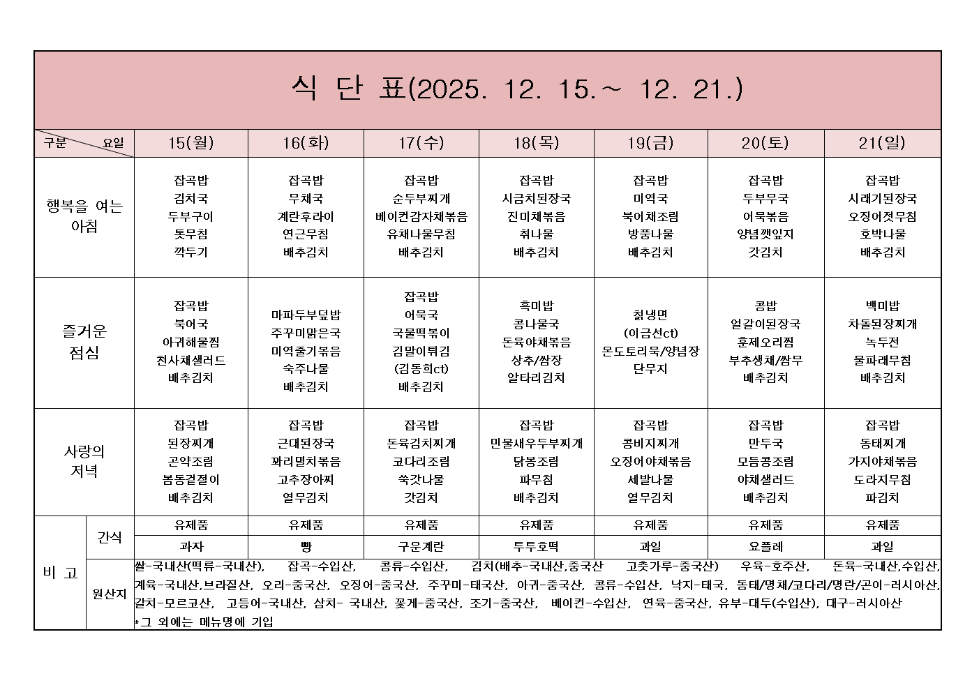 2025년 12월 15일 ~2025년 12월 21일 식단표